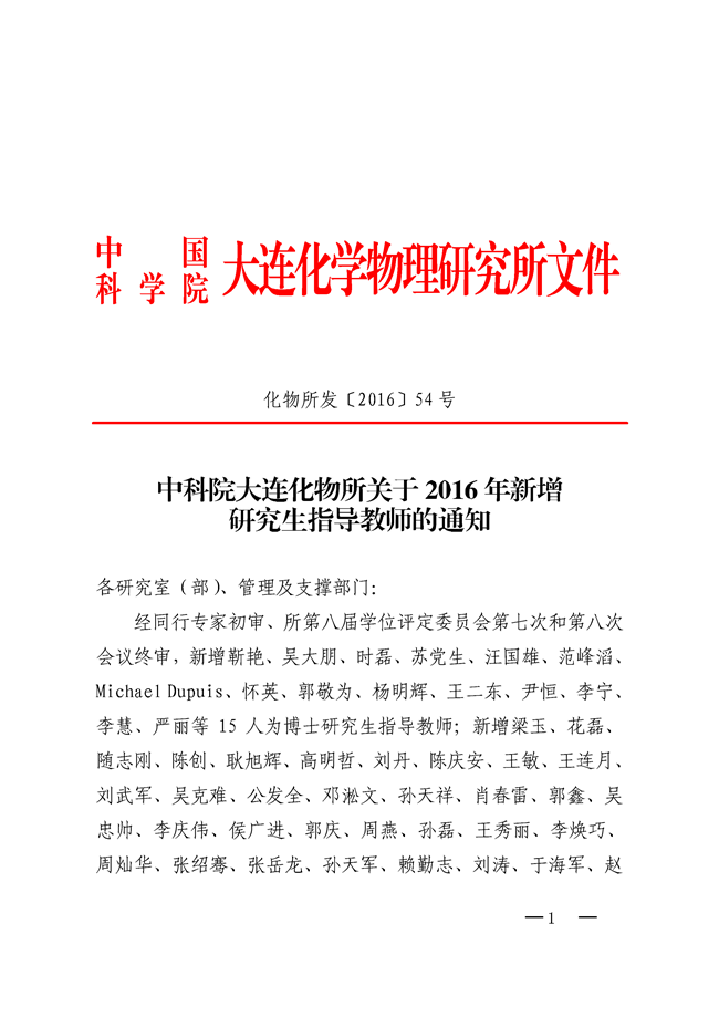中科院大连化物所关于2016年新增研究生指导教师的通知