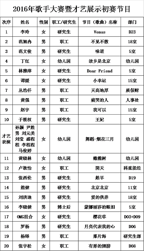 初赛:所内选出8名选手晋级。其中包括大众评委投票前三名和其余选手中专业评委投票前五名。