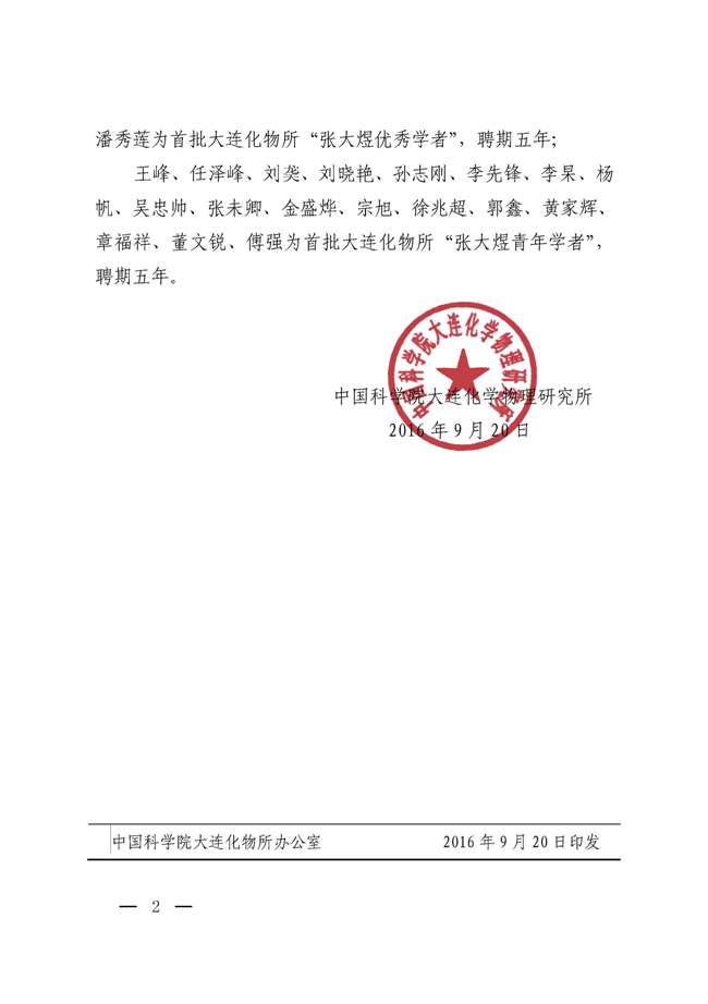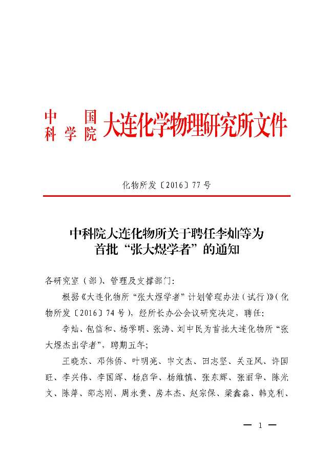 中科院大连化物所关于聘任李灿等为首批“张大煜学者”的通知