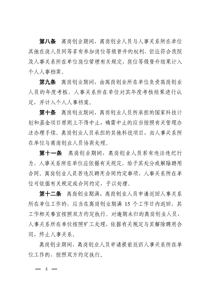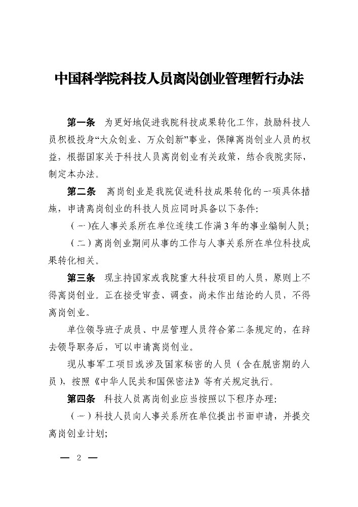 为更好地促进科技成果转化工作,鼓励科技人员积极投身“大众创业、万众创新”事业,保障离岗创业人员的权益,根据国家关于科技人员离岗创业有关政策,结合实际,中国科学院制定《中国科学院科技人员离岗创业管理暂行办法》,现将该《办法》予以转发。