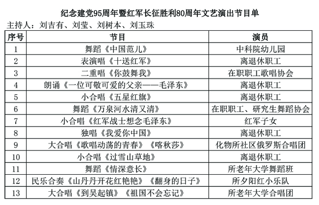 为纪念中国共产党成立95周年和红军长征胜利80周年,我所定于9月28日(周三)上午9:00在能源楼会议中心学术报告厅举行纪念建党95周年暨红军长征胜利80周年文艺演出,届时将有中科院幼儿园、离退休职工、在职职工、研究生、化物所社区的主题节目精彩呈现。