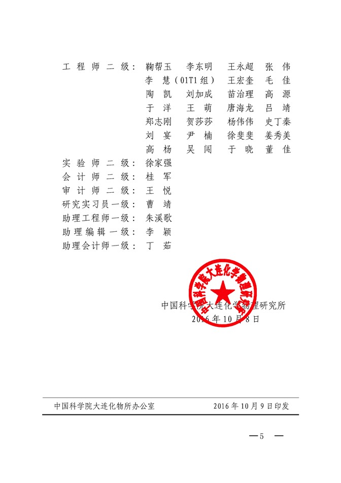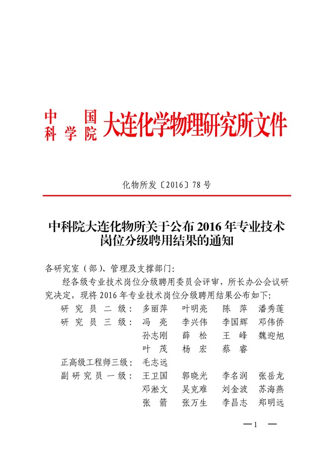 中科院大连化物所关于公布2016年专业技术岗位分级聘用结果的通知