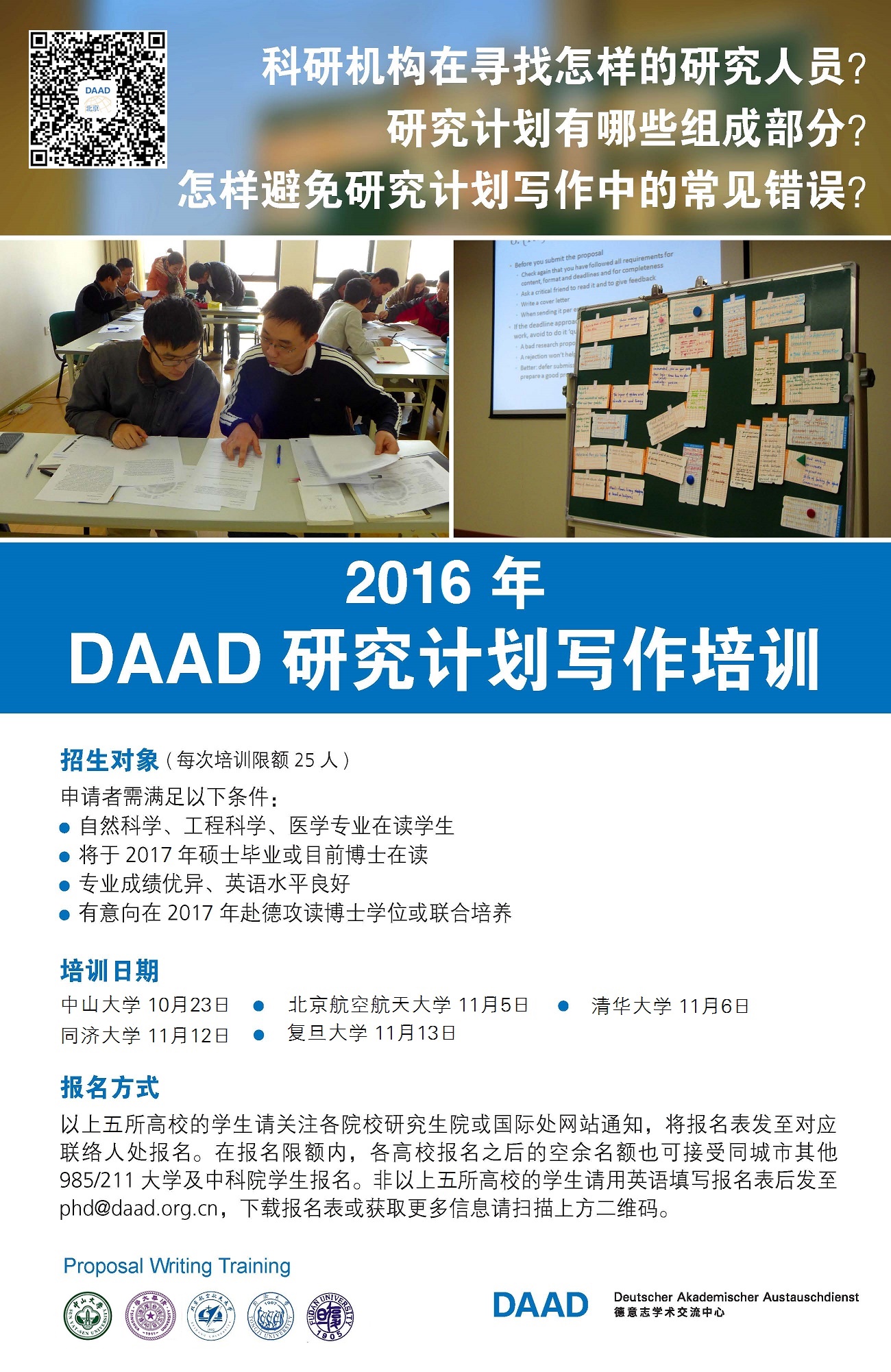 今年秋天德意志学术交流中心(DAAD)将再度与五所国内重点高校合作,为拟申报国家留学基金委(CSC)高水平大学项目或校国际合作培养计划项目出国访学的学生提供一系列研究计划写作培训。研究计划是申请德国攻博/联合培养的重要材料。该培训将传授研究计划(research proposal)的写作技巧,助力学生们成功申请德国攻博/联合培养奖学金。