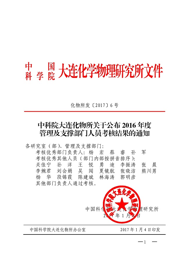 关于公布2016年度管理及支撑部门人员考核结果的通知