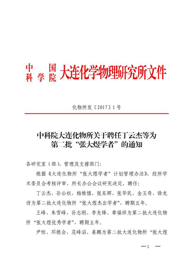 中科院大连化物所关于聘任丁云杰等为第二批“张大煜学者”的通知
