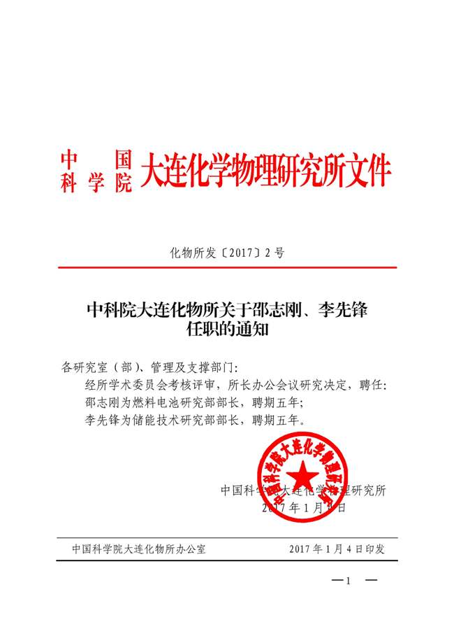 中科院大连化物所关于邵志刚、李先锋任职的通知