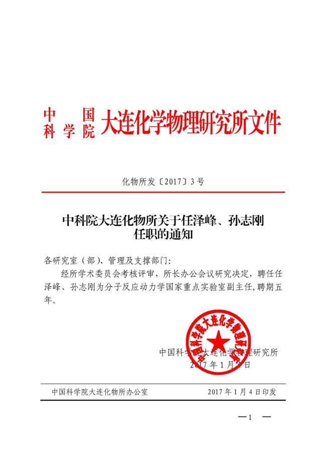 中科院大连化物所关于任泽峰、孙志刚任职的通知