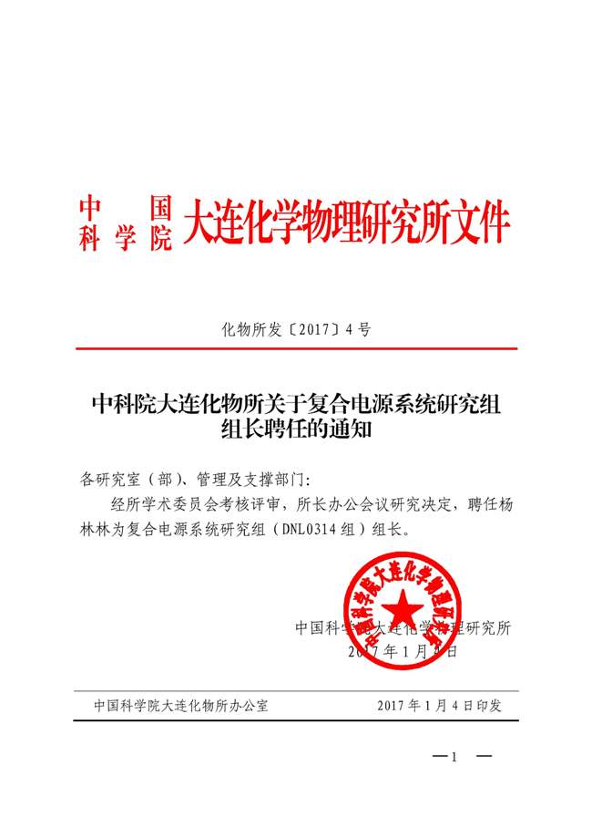 中科院大连化物所关于复合电源系统研究组组长聘任的通知