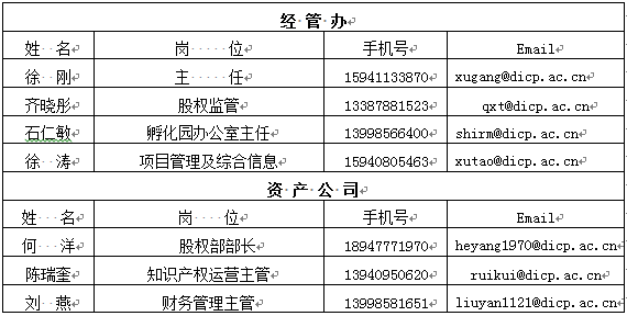 为方便春节假期期间全所同志对产业化及公司方面业务的联络,现将部门工作人员职责和联系方式公布如下: