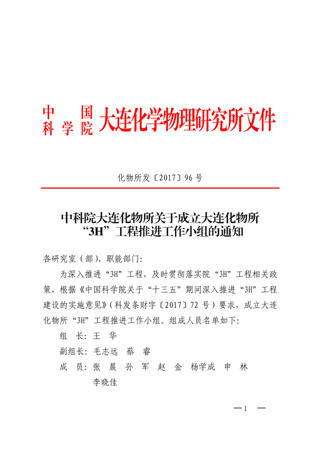中科院大连化物所关于成立大连化物所“3H”工程推进工作小组的通知