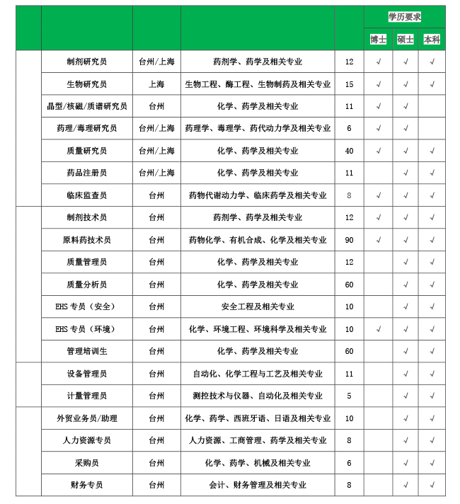 (邮件主题:期望工作地点+应聘岗位-姓名-学校-专业-学历-2018例如:临海-质量研究员-张三-中科院上海有机所-有机化学-硕士-2018)