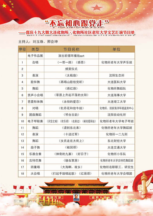 为进一步学习宣传贯彻党的十九大精神,定于12月13日(周三)下午1:10,在能源楼会议中心举行“不忘初心跟党走”——喜庆十九大暨大连化物所·化物所社区老年大学文艺汇演。