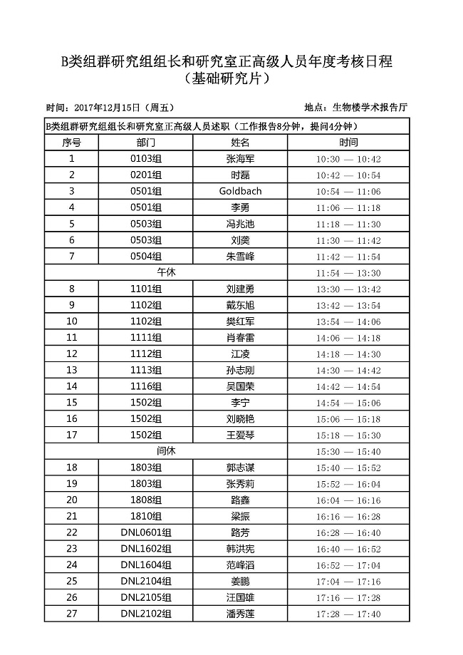 关于B类组群研究组组长和研究室正高级人员年度考核日程(基础研究片)的通知