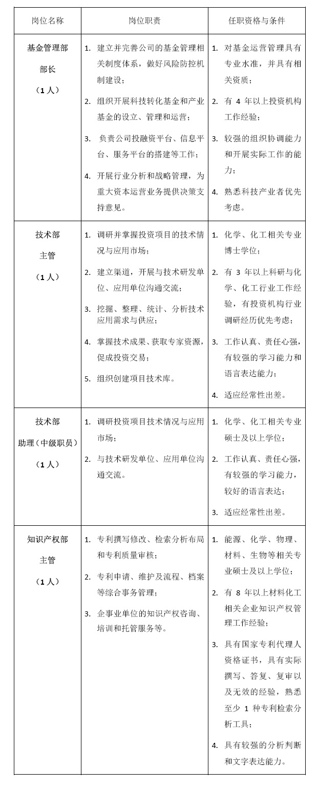 中科化物(大连)科技发展有限公司是中国科学院大连化学物理研究所全资的资产运营与投资管理公司,主要负责我所参控股企业的股权管理,实现资产的保值增值,与专业投资机构合作建立科技基金,以专业化的融资与投资管理推动科技成果产业化,反哺科研工作。根据工作发展需要,本着“按需设岗、公开招聘、竞争上岗、择优聘用”的原则,现面向社会公开招聘。