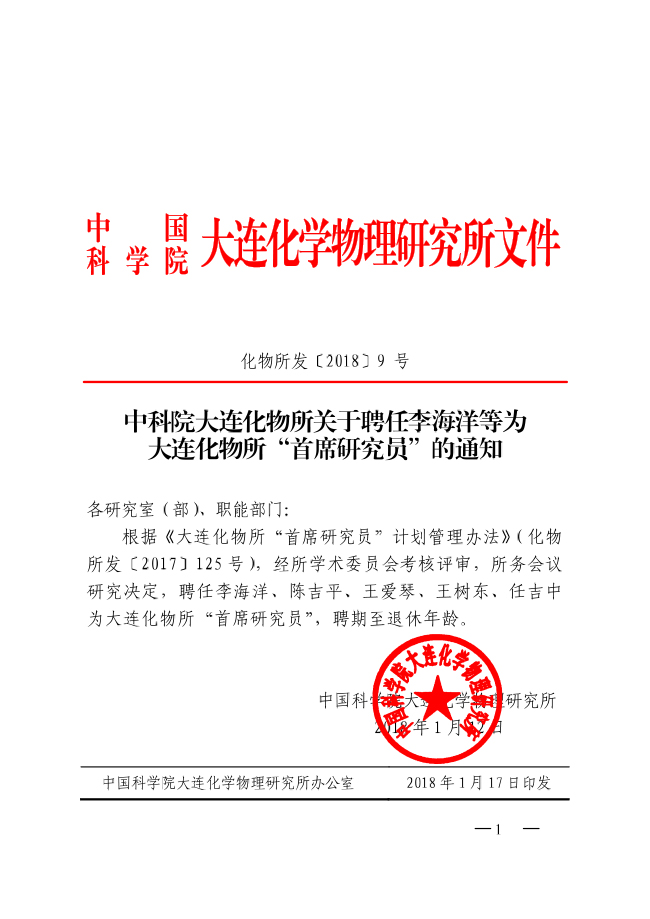 中科院大连化物所关于聘任李海洋等为大连化物所“首席研究员”的通知