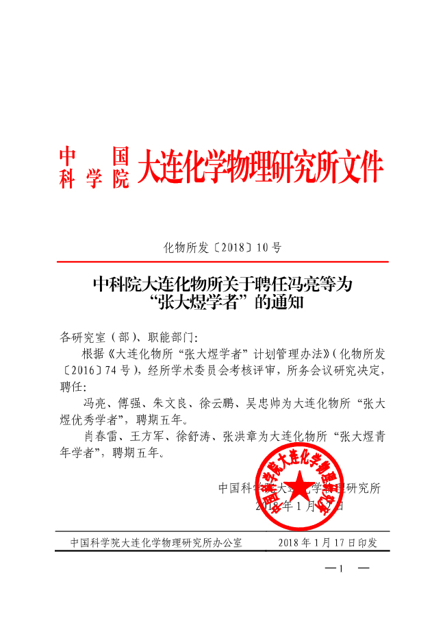 中科院大连化物所关于聘任冯亮等为“张大煜学者”的通知