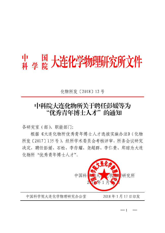 中科院大连化物所关于聘任彭媛等为“优秀青年博士人才”的通知