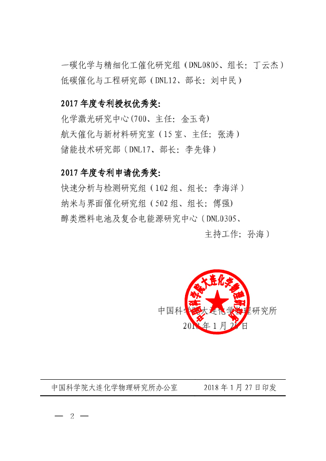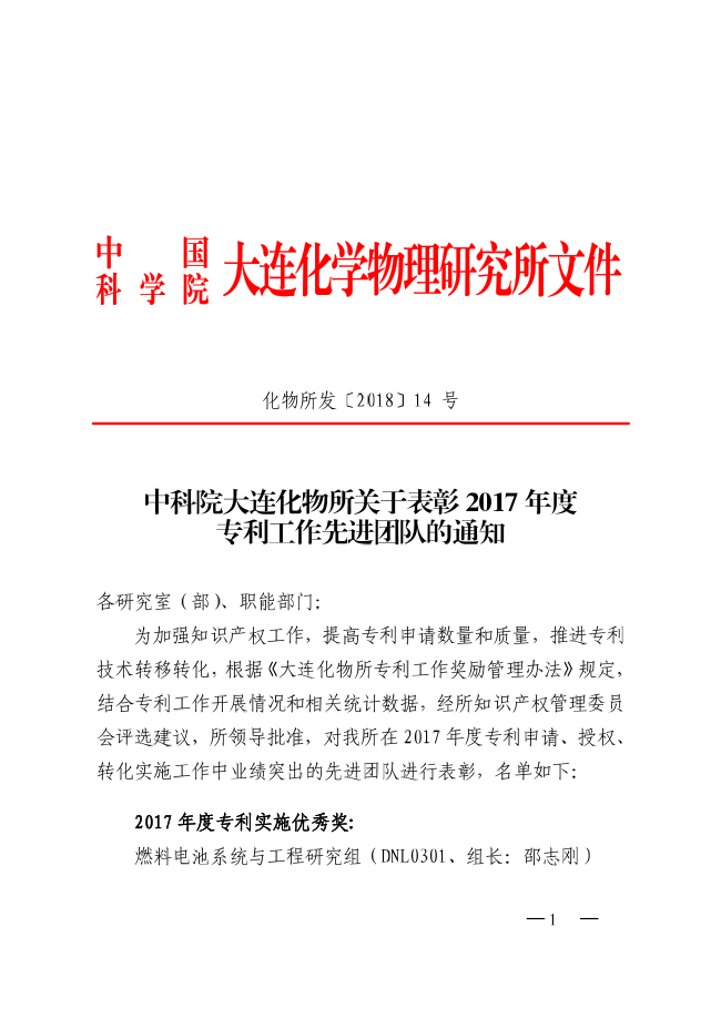 中科院大连化物所关于表彰2017年度专利工作先进团队的通知