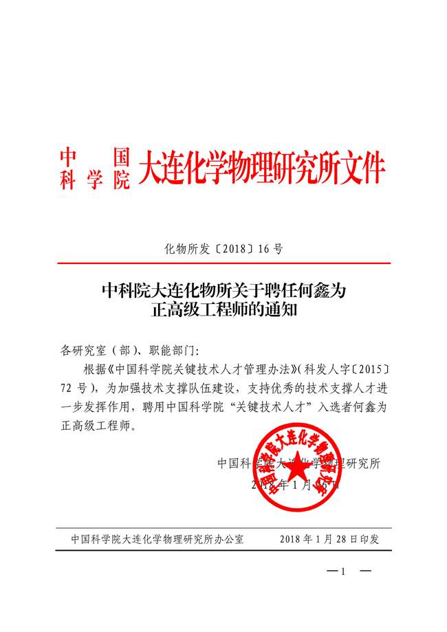 中科院大连化物所关于聘任何鑫为正高级工程师的通知