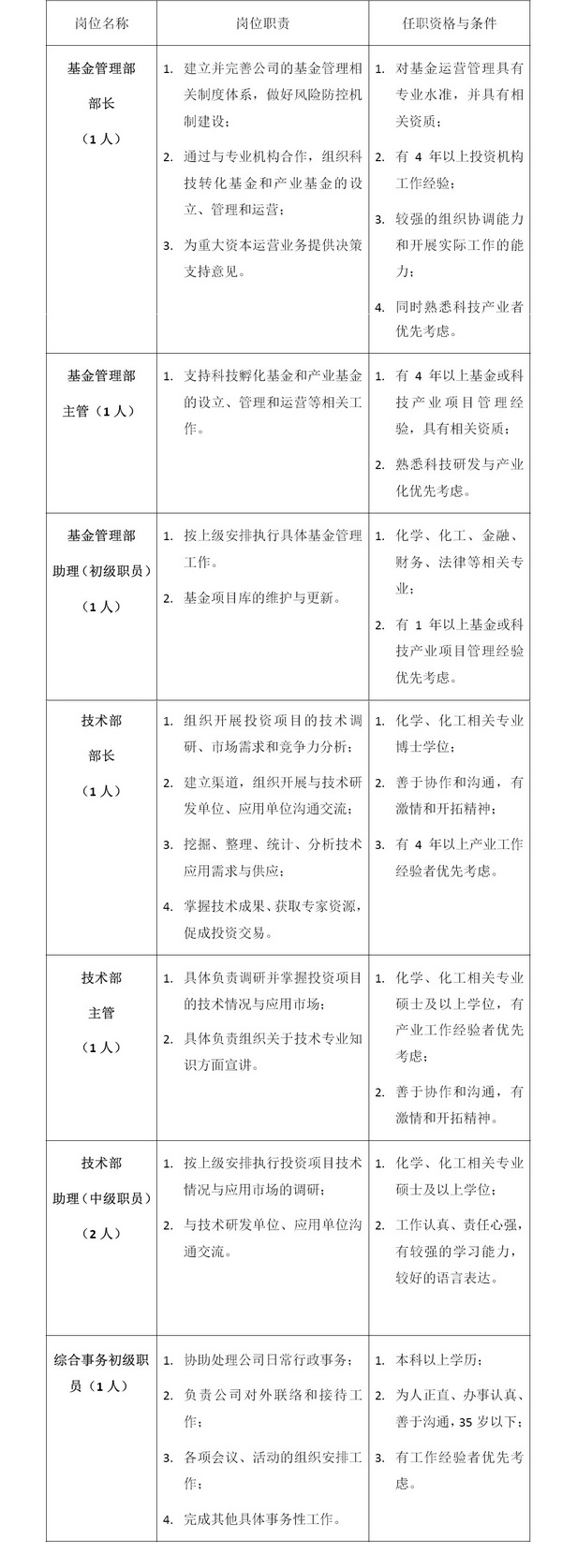 中科化物(大连)科技发展有限公司是中国科学院大连化学物理研究所全资的资产运营与投资管理公司,主要负责大连化物所参控股企业的股权管理,实现资产的保值增值,与专业投资机构合作建立科技基金,以专业化的融资与投资管理推动科技成果产业化,反哺科研工作。根据工作发展需要,本着“按需设岗、公开招聘、竞争上岗、择优聘用”的原则,现面向社会公开招聘。