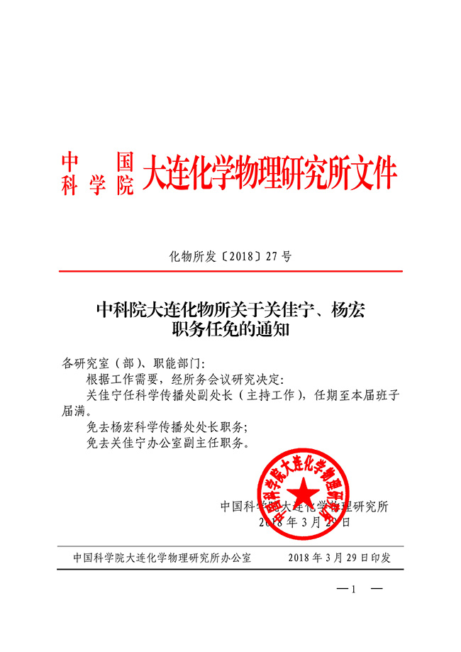 中科院大连化物所关于关佳宁、杨宏职务任免的通知