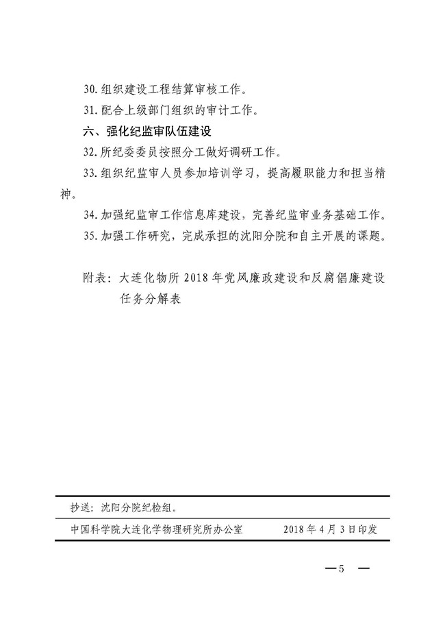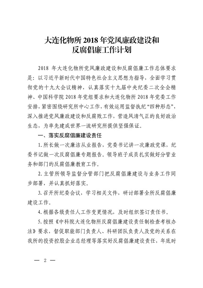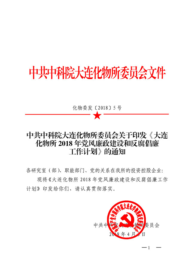 中共中科院大连化物所委员会关于印发《大连化物所2018年党风廉政建设和反腐倡廉工作计划》的通知