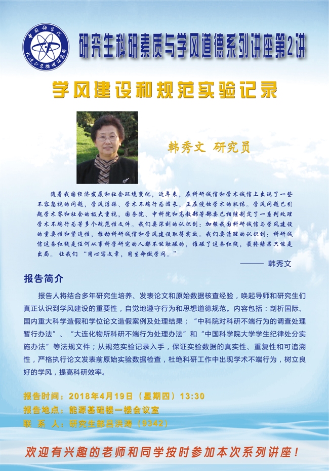 关于研究生科研素质与学风道德系列讲座第2讲——学风建设和规范实验记录的通知