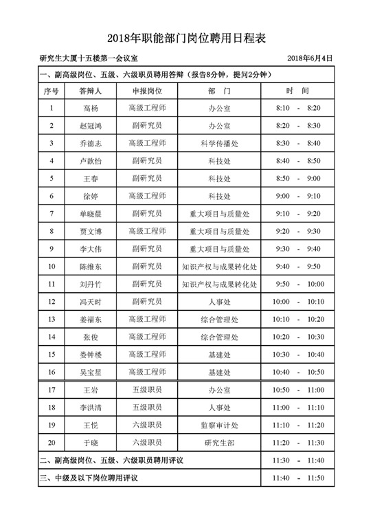 兹定于6月4日召开2018年职能部门岗位聘用答辩会,进行副高级专业技术岗位推荐评审,五级、六级职员岗位、中级及以下专业技术岗位聘用评审,欢迎所内职工参加。