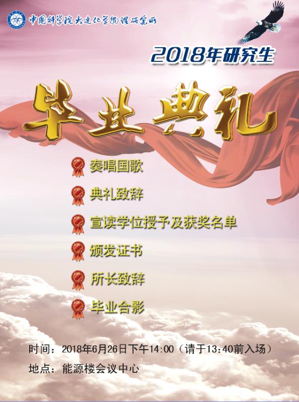 我所2018年研究生毕业典礼将于6月26日(星期二)下午14:00在能源楼会议中心举行。届时中国科学院大学领导,我所领导、导师、优秀校友、设奖企业代表、毕业生代表、获奖学生代表、研究生代表及毕业生家长等将出席典礼。为保证毕业典礼按时顺利举行,请参加毕业典礼的毕业生代表、获奖学生代表以及研究生代表于13:40前入场。