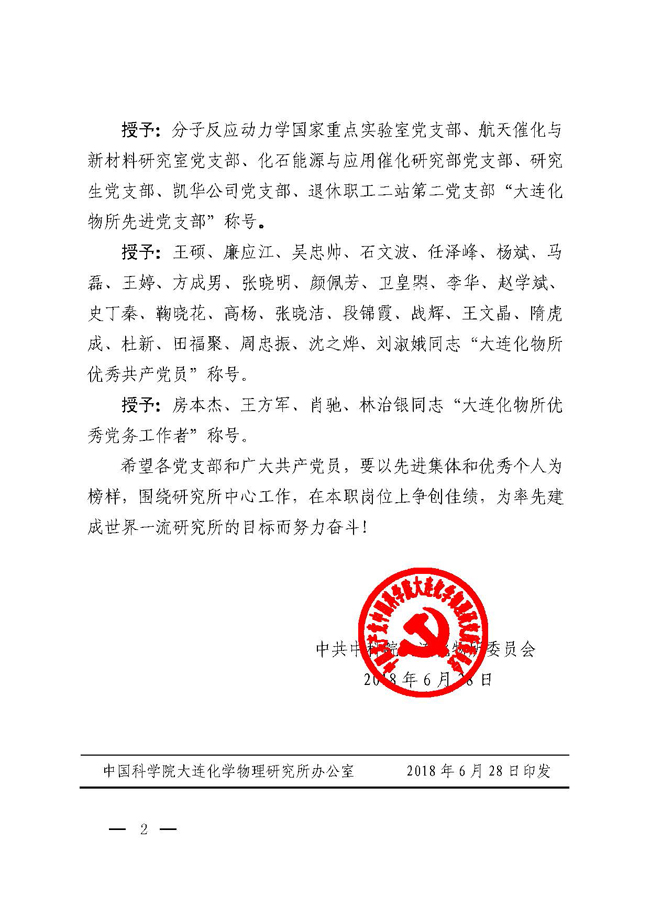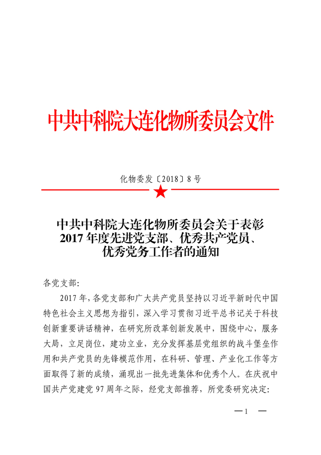 中共中科院大连化物所委员会关于表彰2017年度先进党支部、优秀共产党员、优秀党务工作者的通知
