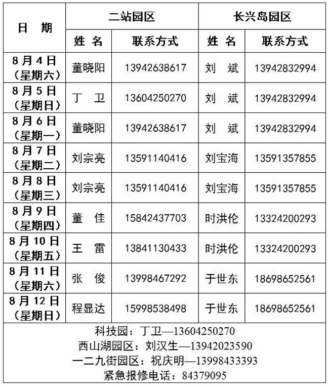综合管理处/长兴岛园区综合处2018年暑假假期值班表