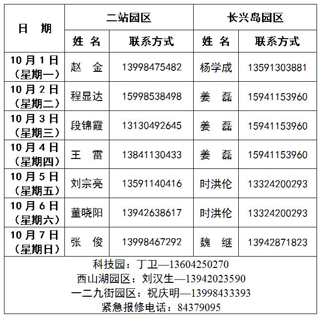 综合管理处/长兴岛园区综合处国庆假期值班表