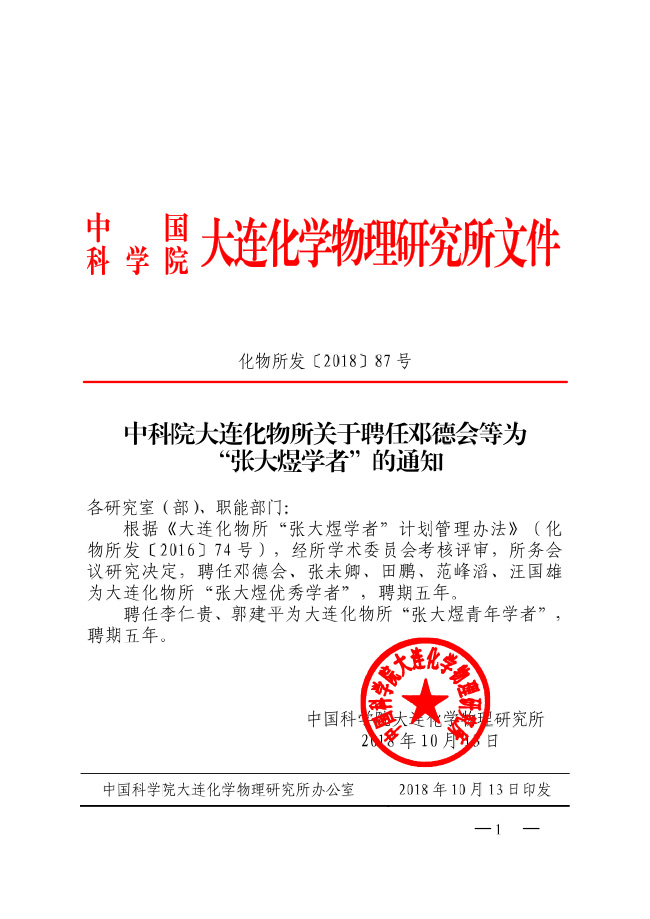 中科院大连化物所关于聘任邓德会等为“张大煜学者”的通知