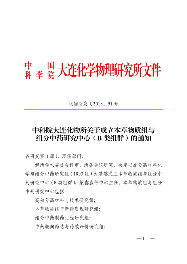 中科院大连化物所关于成立本草物质组与组分中药研究中心(B类组群)的通知