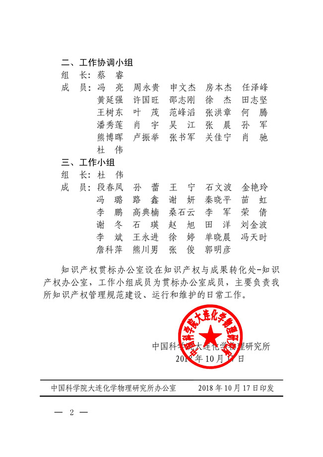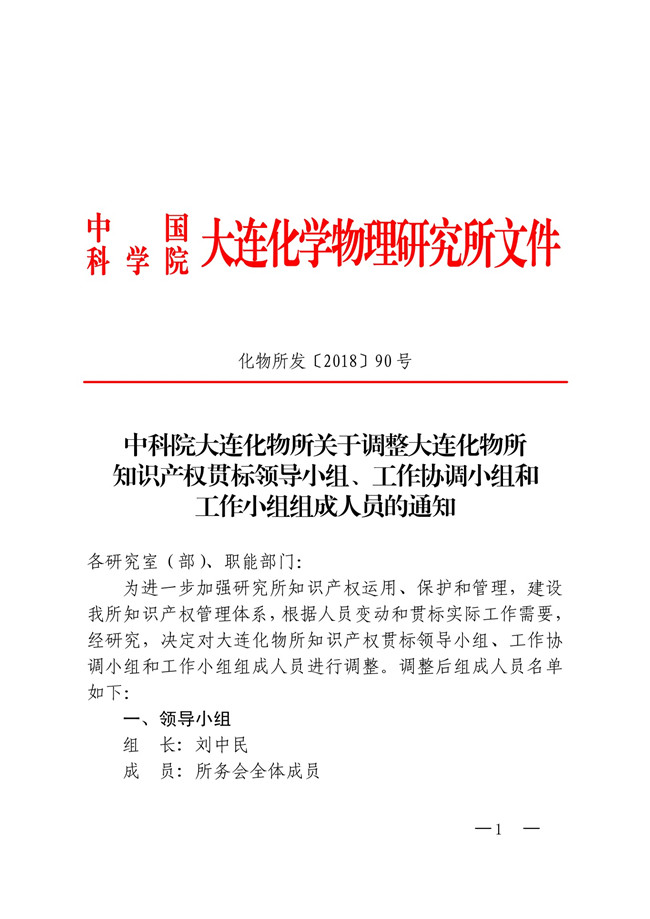 中科院大连化物所关于调整大连化物所知识产权贯标领导小组、工作协调小组和工作小组组成人员的通知