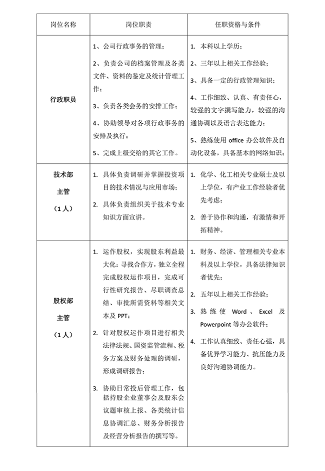 中科化物(大连)科技发展有限公司是中国科学院大连化学物理研究所全资的资产运营与投资管理公司,主要负责大连化物所参控股企业的股权管理,实现资产的保值增值,与专业投资机构合作建立科技基金,以专业化的融资与投资管理推动科技成果产业化,反哺科研工作。根据工作发展需要,本着“按需设岗、公开招聘、竞争上岗、择优聘用”的原则,现面向社会公开招聘。
