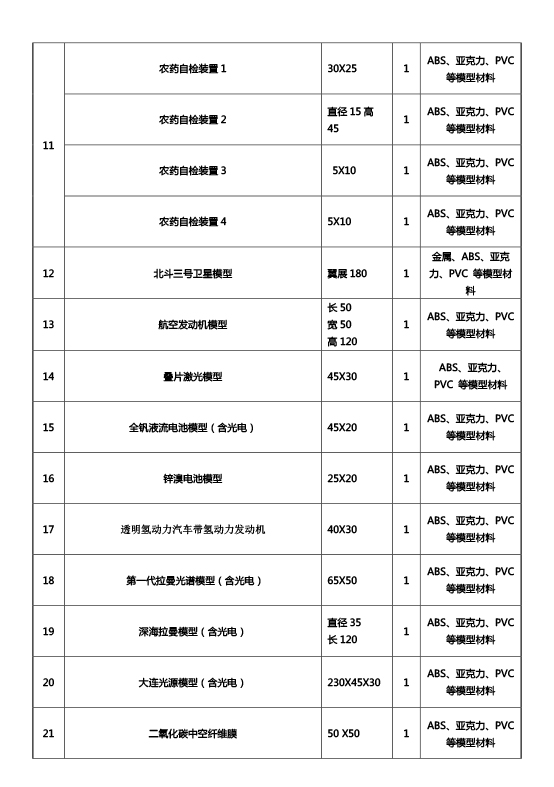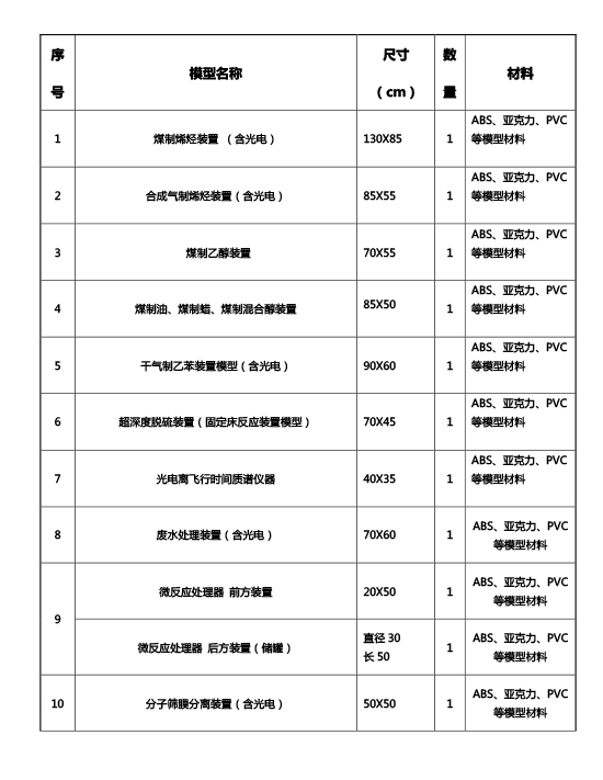 六、采购范围:煤制烯烃工业装置模型、煤制乙醇工业示范装置模型、合成气制烯烃工业装置模型、干气制乙苯工业装置模型、汽柴油超深度脱硫工业装置模型等21个模型,具体模型内容及参考尺寸如下: