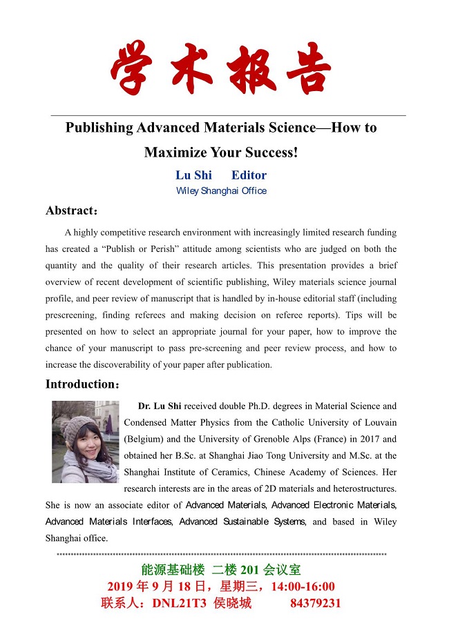 关于举行“Publishing Advanced Materials Science—How to Maximize Your Success!”学术报告的通知