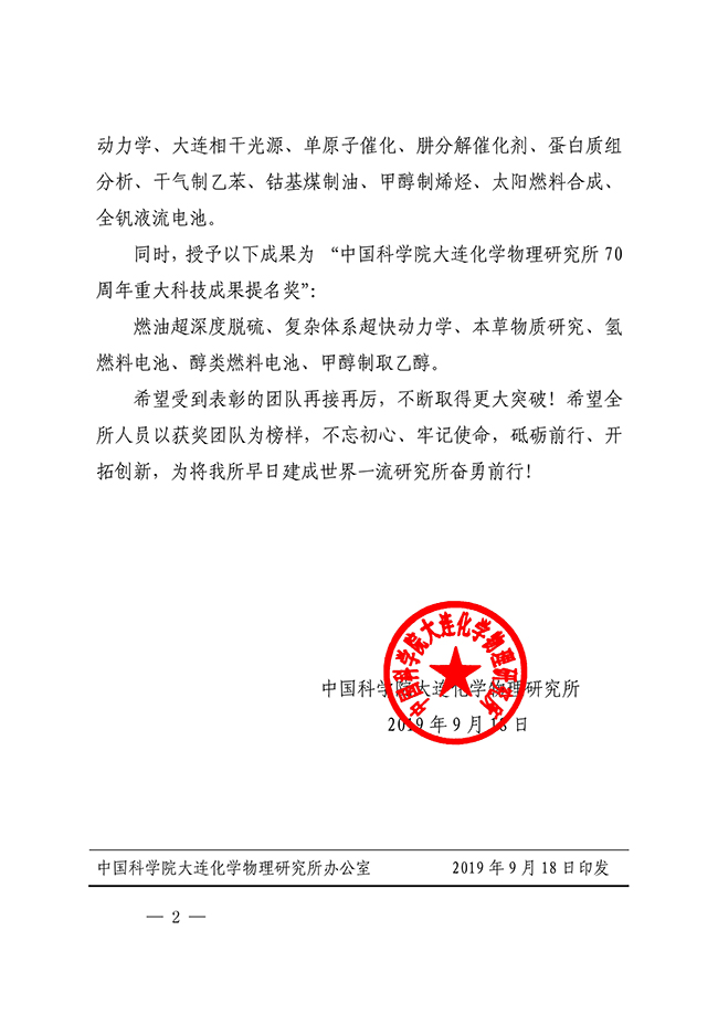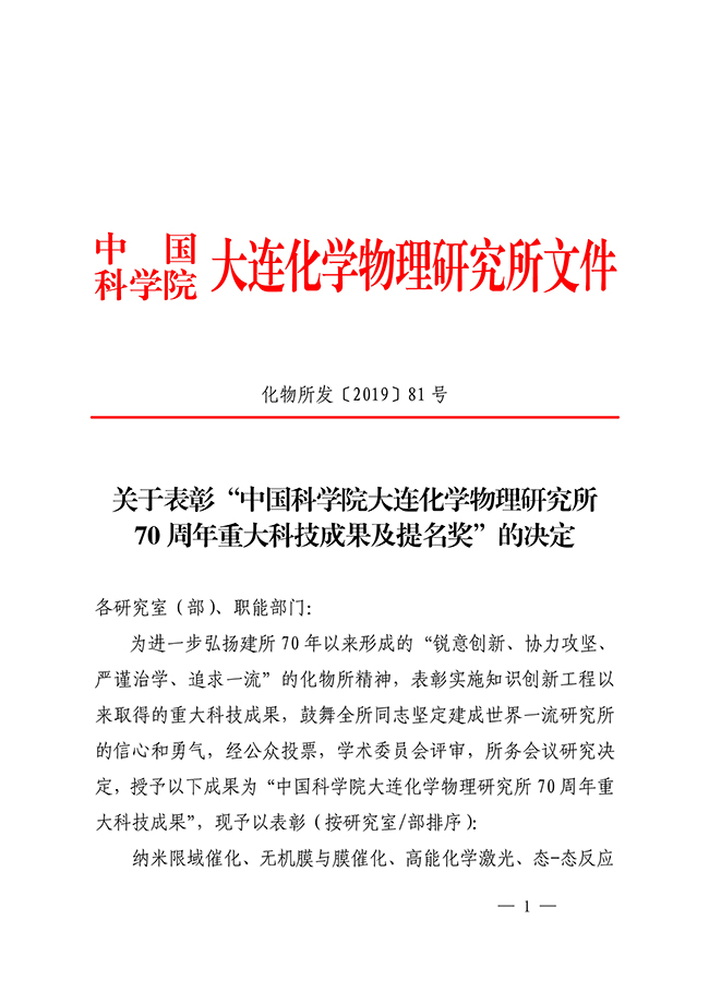 关于表彰“中国科学院大连化学物理研究所70周年重大科技成果及提名奖”的决定