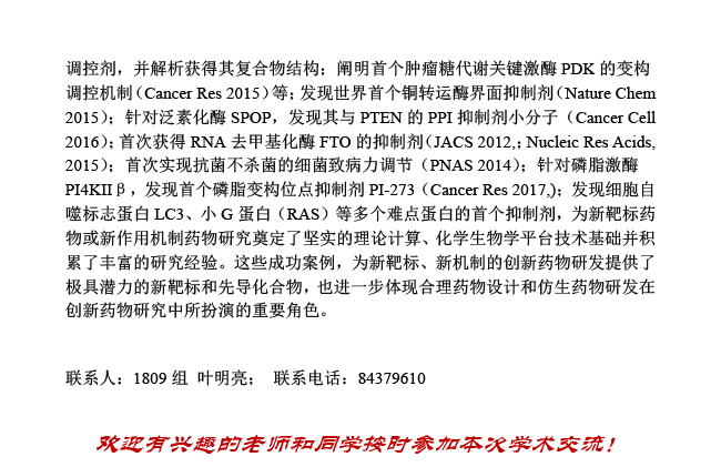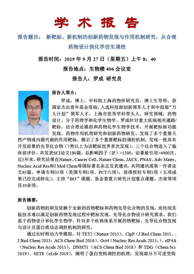 关于举行“新靶标、新机制的创新药物发现与作用机制研究:从合理药物设计到化学仿生调控”学术报告的通知