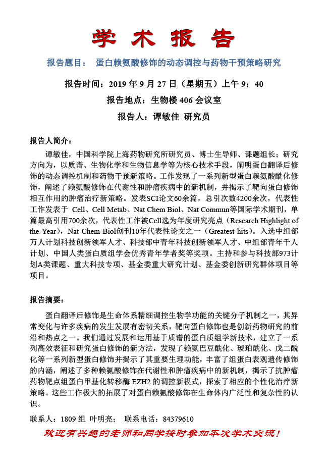 关于举行“蛋白赖氨酸修饰的动态调控与药物干预策略研究”学术报告的通知