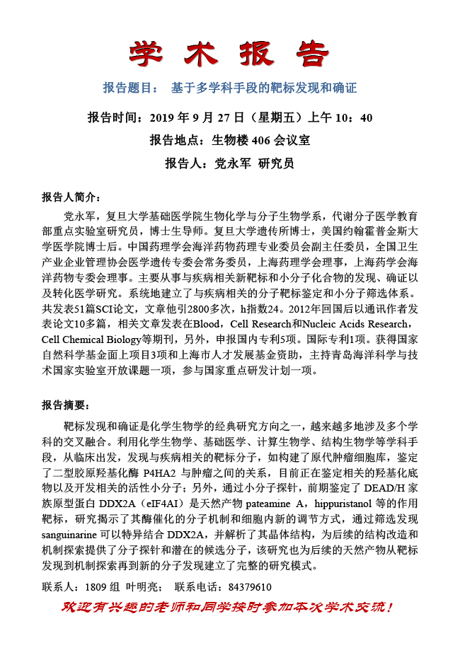 关于举行“基于多学科手段的靶标发现和确证”学术报告的通知