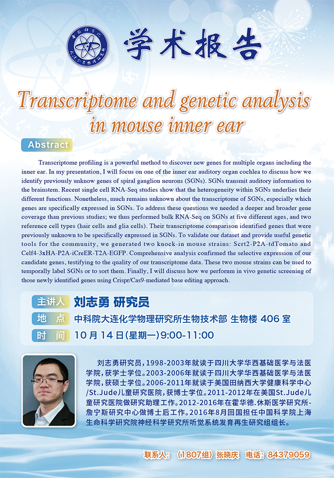 关于举行“Transcriptome and Genetic Analysis in Mouse Inner Ear”学术报告的通知