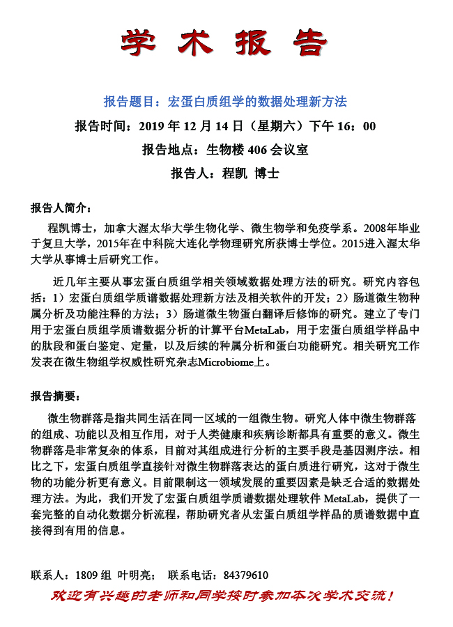 关于举行“宏蛋白质组学的数据处理新方法”学术报告的通知