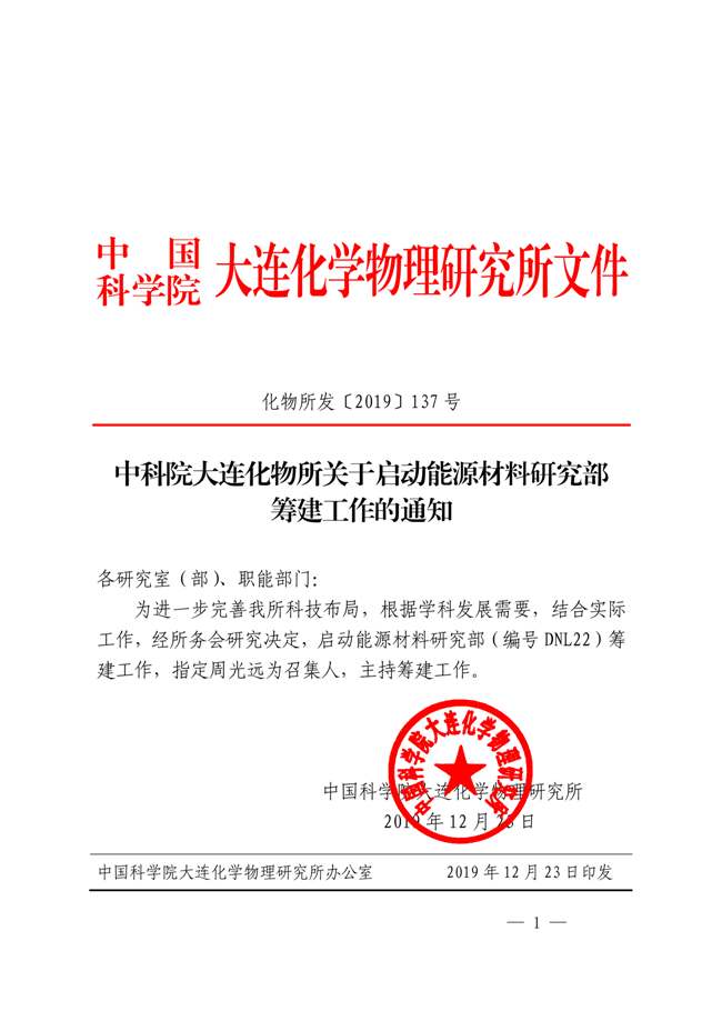 中科院大连化物所关于启动能源材料研究部筹建工作的通知