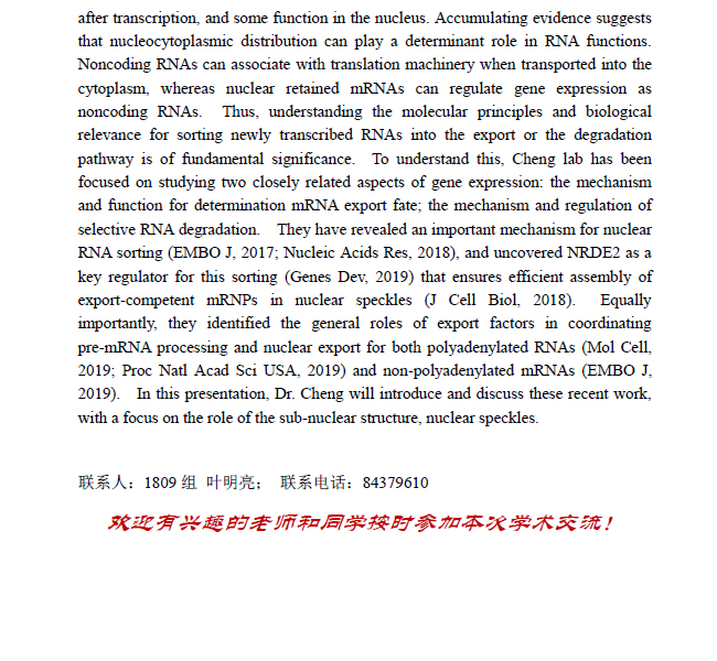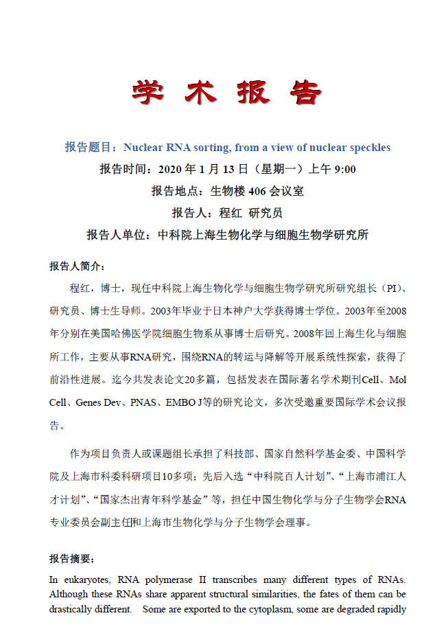 关于举行“Nuclear RNA sorting, from a view of nuclear speckles”学术报告的通知
