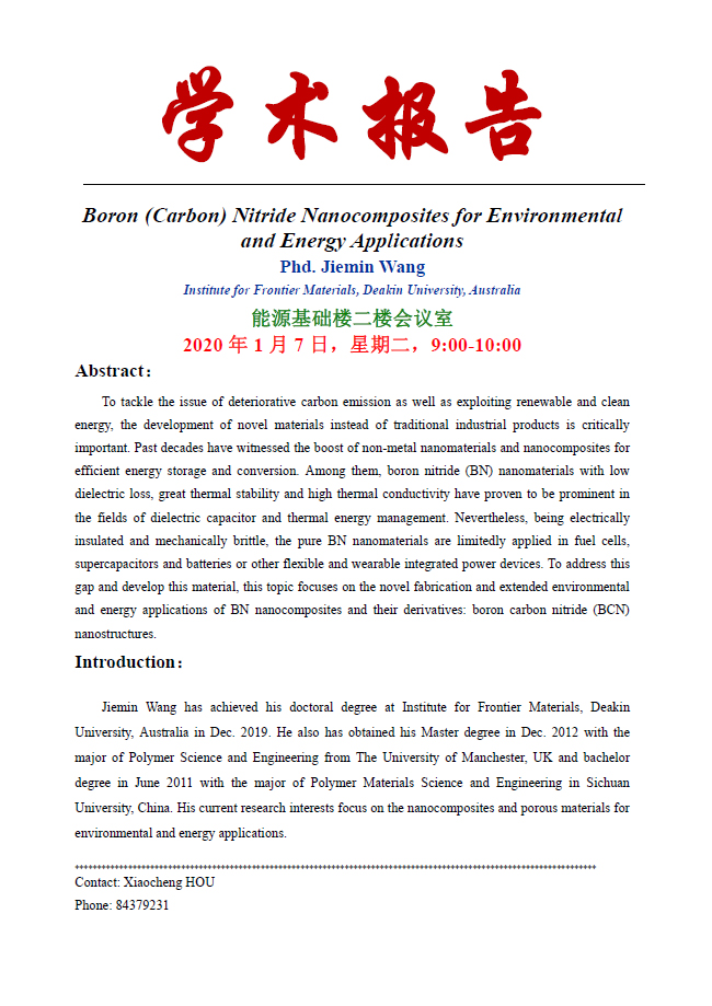关于举行“Boron (Carbon) Nitride Nanocomposites for Environmental and Energy Applications”学术报告的通知