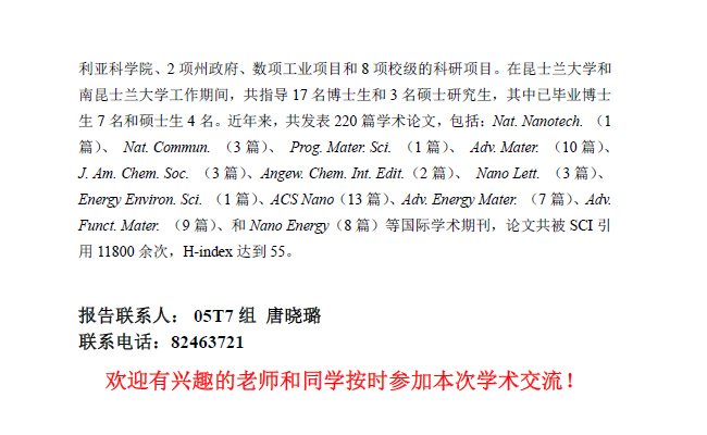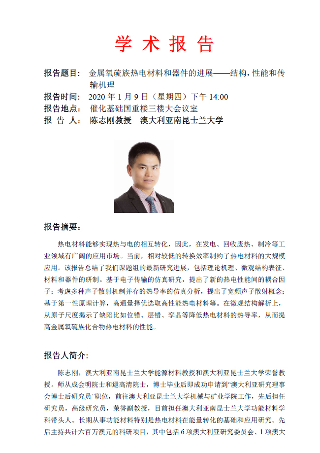 关于举行“金属氧硫族热电材料和器件的进展——结构,性能和传输机理”学术报告的通知