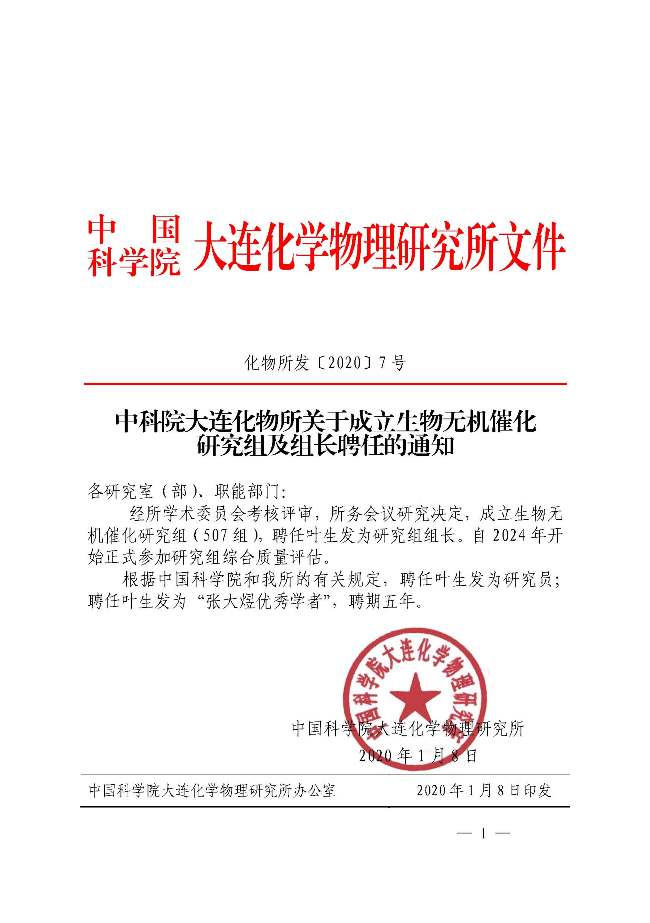 中科院大连化物所关于成立生物无机催化研究组及组长聘任的通知