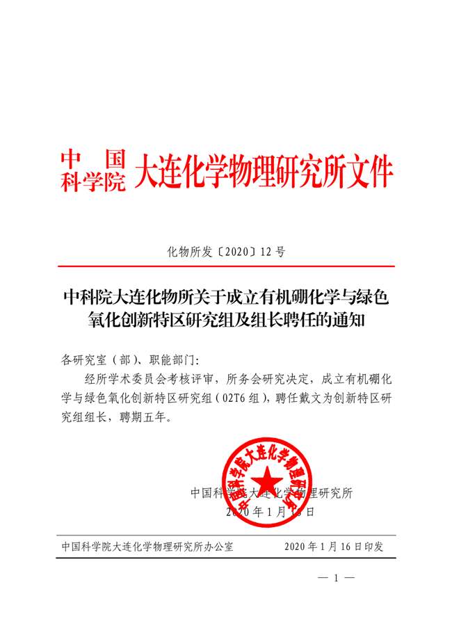 中科院大连化物所关于成立有机硼化学与绿色氧化创新特区研究组及组长聘任的通知